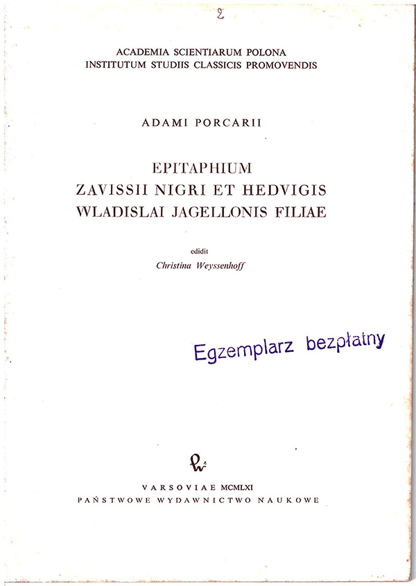 Napisz pierwszą opinię o „Adami Porcarii : Epitaphium Zavissii Nigri et Hedvigis Wladislai Jagellonis filiae”